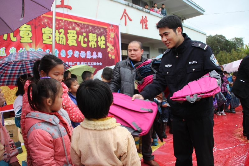 ????當天,廣西西江義工聯合會2014年關注孤殘、留守兒童“圓夢行動”在藤縣太平鎮石夏村小學舉行,為130多名孤殘、留守兒童送去了書包、點讀機、籃球、自行車等物品一批。 李偉明 林祟海 攝