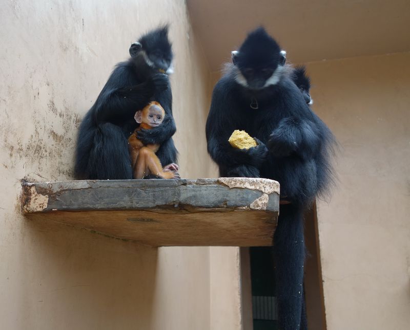 ????3月14日,剛出生一個多月的黑葉猴寶寶和媽媽在一起。