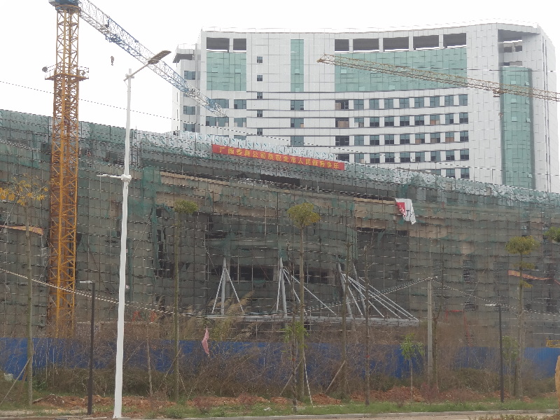 ? 3月15日,工人在對梧州市人民醫院新址的門診醫技樓進行室外裝修。