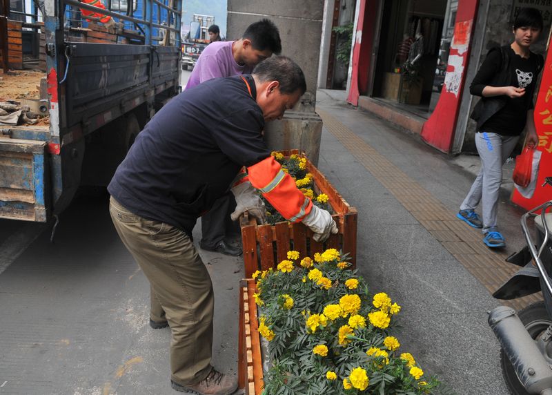 ??? 3月20日,在南環路,工人正更換路邊的木質花壇。