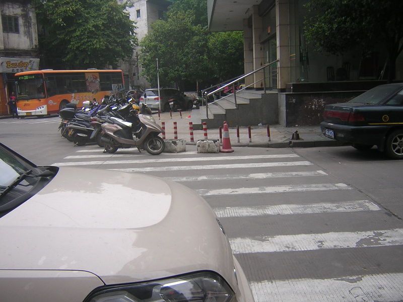 ??? 北環路原北山飯店前一條斑馬線被人用鐵柱、石頭等阻攔放車,但車輛依然照停放,阻礙了行人過馬路。 李定國/攝