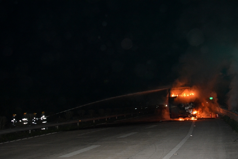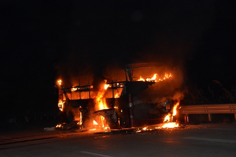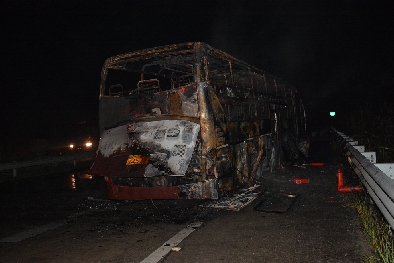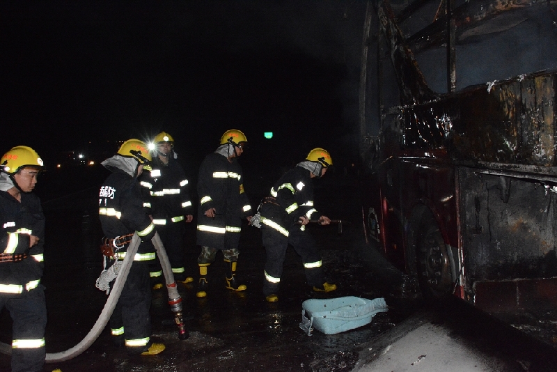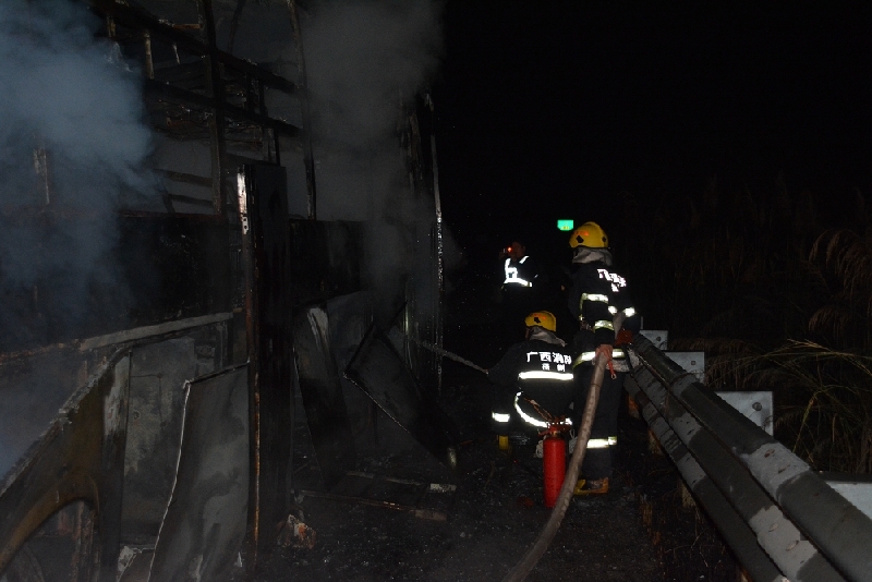 ????當(dāng)日凌晨1時(shí)09分,梧州市119指揮中心接到報(bào)警后,立即調(diào)集岑溪中隊(duì)2輛水罐消防車,趕赴岑羅高速路羅定往岑溪方向歸義出口處。1時(shí)35分,消防官兵到達(dá)現(xiàn)場(chǎng),大客車已被大火團(tuán)團(tuán)圍住,現(xiàn)場(chǎng)濃煙彌漫、火光沖天,經(jīng)詢問偵察,司乘人員已全部疏散至安全地帶,消防官兵迅速行動(dòng)滅火。1時(shí)45分,大火得到控制后,官兵在水槍的掩護(hù)下逐片消滅余火,并利用撬棍等工具實(shí)施破拆,檢查油箱情況。至2時(shí)10分,明火被全部撲滅。