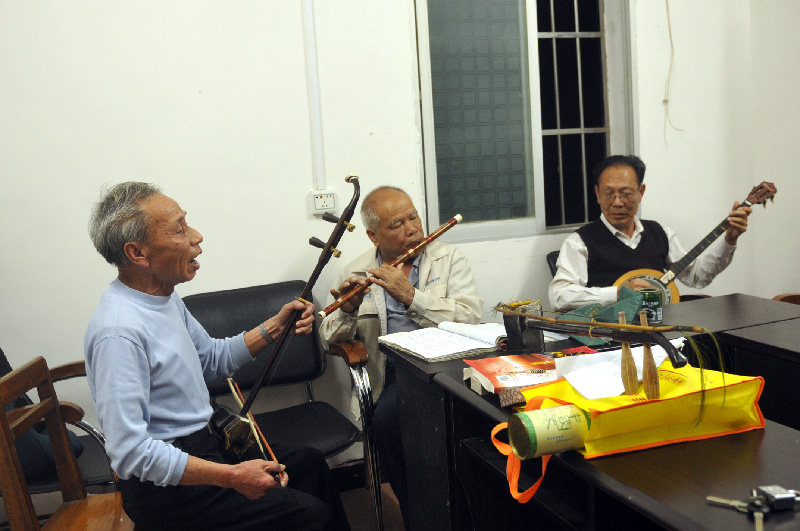 幾位老人經常聚在一起“玩音樂”,用他們手中的樂器演奏出悅耳的歌曲。