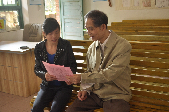 華機社區的工作人員向董乾甦老人(右)解釋相關政策。西江都市報記者 萬立平/攝