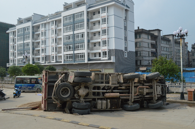 ??? 3月27日上午,在蒙山縣城第一中學(xué)大門前的路段,有一輛裝滿細(xì)沙的重型大貨車在此路過。司機(jī)在倒車掉頭時(shí),后輪壓塌了一個(gè)水泥井蓋,引發(fā)側(cè)翻事故,沙子灑滿一地,幸無人員受傷。(戴連升 彭峰/攝)