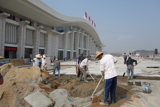 ????3月26日,在南廣鐵路梧州南站站前廣場,工人正鋪設地磚。南廣鐵路廣西段開通運營在即,梧州南站抓緊綠化鋪磚、貴賓車道、臨時停車場等站前項目施工,確保旅客出站口以西部分如期交付使用。黃金銘 攝