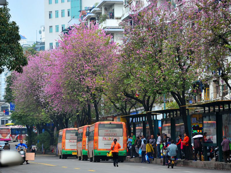 ??? 3月28日,在梧州市阜民路,道路一側(cè)的紫荊花樹綻放出滿樹粉紅色的花朵。