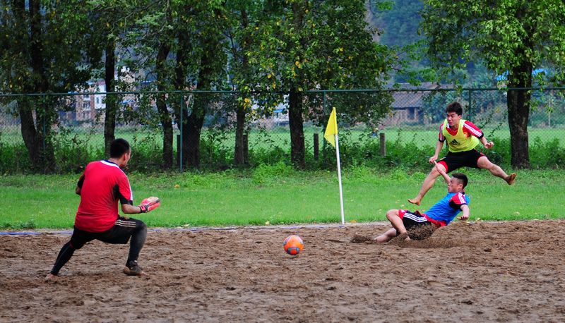 ????隨后,激烈的對抗訓(xùn)練賽緊接著上演。下了近2天的大雨停了,陽光微風(fēng)下,運(yùn)動員在賽場上激情展示沙灘足球的各種高難動作,鏟球、抽射、帶球突破,一招一式威風(fēng)十足。對抗賽剛開始,足球一落在沙灘上,隊員馬上就利用挑球來讓足球“飛”起來。只見藍(lán)隊隊員在后場拿球后突然一腳冷射,球直奔球門死角,破門得分。緊接著,紅隊隊員馬上作出調(diào)整,傳球變得更加犀利,配合默契,一名隊員看準(zhǔn)守門員拋出的球,抓住這一時機(jī),通過側(cè)凌空射門繼而打入一球……