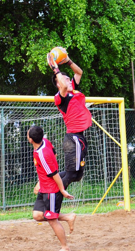 ????凌鷺輝舉例說,沙足所使用的球材質(zhì)比較輕,要是射門時發(fā)力足,在守門員面前球?qū)⒊尸F(xiàn)飄移的狀態(tài),加上沙足運(yùn)球的軌跡不規(guī)則,守門員無法如11人制足球的守門員那樣一直接球,而是盡量把球撲擋出去。如果看到球是彈地的,要第一時間向前壓,盡量在球彈第二下的時候就把球控制住。如果讓球接連彈第二、第三下,球就會改變方向改變速度,會更難控制。