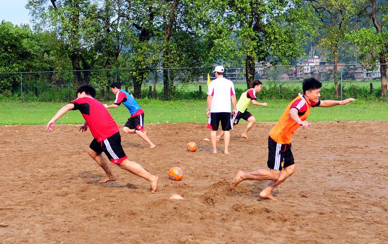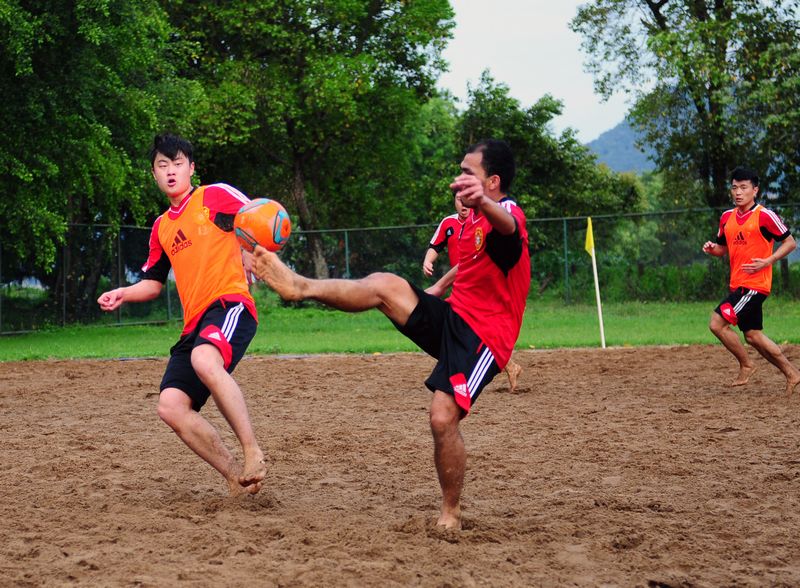 ????中國沙灘足球隊在2012年獲得第三屆亞洲沙灘運(yùn)動會沙灘足球比賽亞軍,去年更歷史性地奪得2013年沙灘足球亞洲杯的冠軍。這支2006年開始組建,平均年齡只有25歲的年輕隊伍如何延續(xù)成績,突破自身十分值得思考的。和職業(yè)足球俱樂部不同,沙足國家隊大部分隊員都是非職業(yè)球員,“大家平常都有自己的學(xué)業(yè)或工作,我們通常在賽前3到4周開始集中訓(xùn)練。”凌鷺輝2006年進(jìn)入國家隊,在他看來,國家隊面臨著選材困難,“沙足這個項目對球員的體能要求比較高,鑒于我們的隊員大部分是大學(xué)生或已經(jīng)走上工作崗位的業(yè)余球員,只有個別隊員是職業(yè)運(yùn)動員,為了讓隊員們養(yǎng)成自覺進(jìn)行體能訓(xùn)練的習(xí)慣,我們決定從今年開始,每一期集訓(xùn)前都會進(jìn)行體測,體測不合格的隊員必須離開,利用這種壓力與緊迫感,在隊內(nèi)形成競爭意識。體測不是最終的目的,而是引導(dǎo)隊員自覺加強(qiáng)、保持體能。”