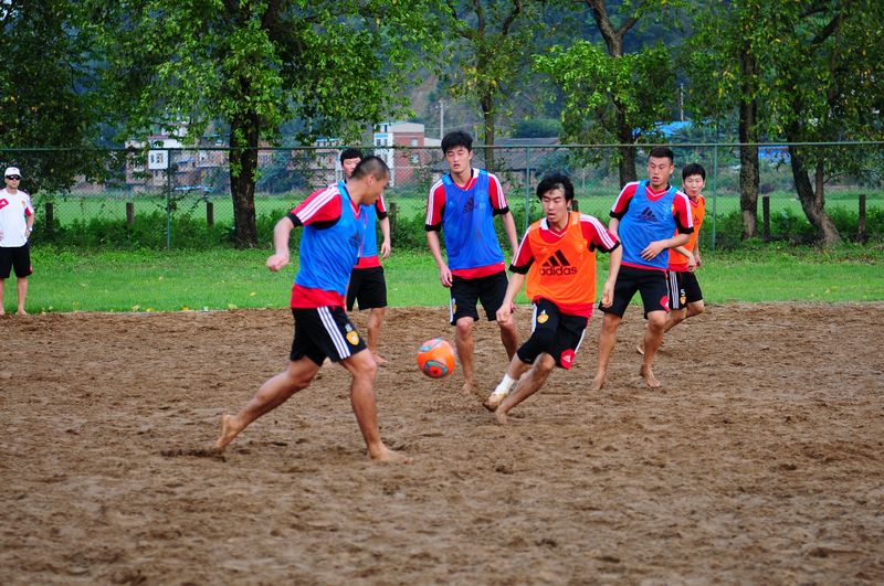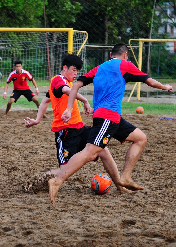 ????也正是這偶然性,使得沙足的看點(diǎn)大大增加,不少在11人制足球賽中不太常見的技術(shù)都能在沙足的賽場上實(shí)現(xiàn)。隊員在接球以后,可以自如地運(yùn)用凌空抽射、倒掛金鉤、平行傳球等技術(shù),即使摔倒在地,只要球員夠靈活,還可以繼續(xù)控球和傳球,而沒有在草地或硬地被擦傷的擔(dān)憂。“一般來說,沙足在射門、空中傳遞的配合以及攻防轉(zhuǎn)換的速度上,會比11人制足球賽更快,比賽中的控球、傳遞球不會太多,通常我們要求隊員在2到3次觸球以后就要完成射門動作。射門以后,如果沒有進(jìn)球,球出界了,緊接著會有角球、界外球出現(xiàn),由此也會有更多戰(zhàn)術(shù)的配合,這些都會是新的看點(diǎn)。可以說,每一場沙足比賽都會有精彩的射門。”金正民頗為自信地言道。