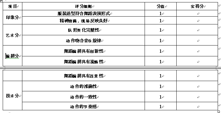 ????3、編排分(3分):評(píng)價(jià)舞蹈整體編排效果。要求動(dòng)作編排必須顯示身體全面的協(xié)調(diào)能力,隊(duì)形變化不少于四次,具有創(chuàng)新性、流暢性、連貫性。