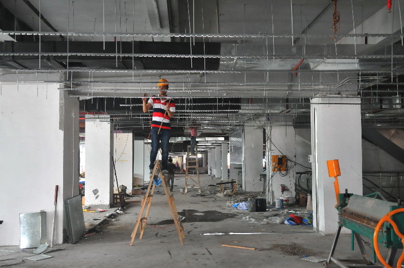 ????4月10日,在文華購物中心,工人正安裝電線線槽。