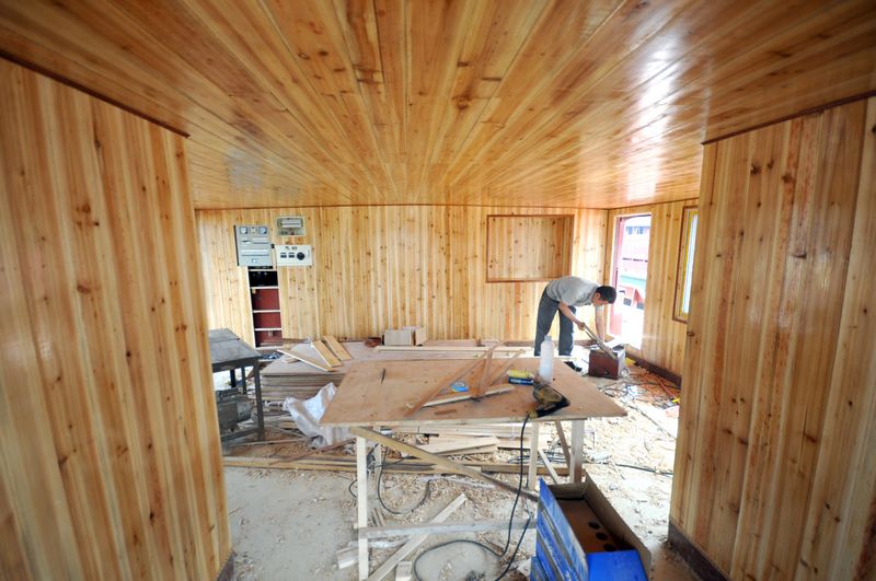 一艘即將完成制造的貨船生活艙內(nèi),施工人員正根據(jù)船主的需要在進(jìn)行室內(nèi)裝修。