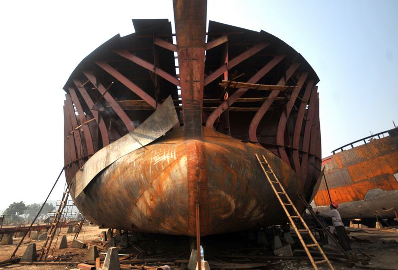 ????生產(chǎn)班班長何云朝帶領(lǐng)著他的工友們切割船用鋼板,他們正在為客戶制造一艘3000多噸的多用途集裝箱船。一旁的船臺(tái)上,停泊著幾艘即將下水交付使用的大船。