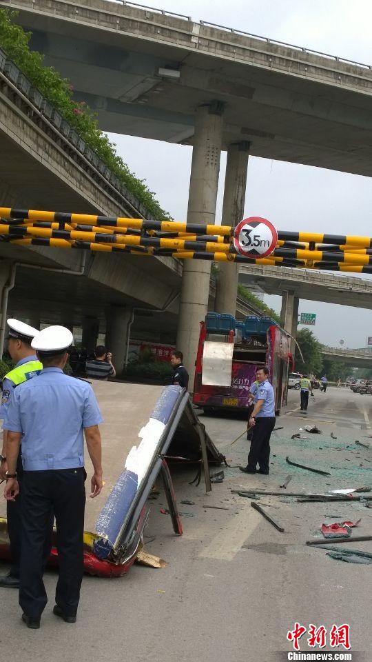 ??? 新華網南寧4月15日電(記者 向志強 張周來)記者從南寧有關部門獲悉,15日上午11時左右,南寧一輛雙層公交車行駛至竹溪大道青竹立交橋底時,與橋架限高防控架相刮,造成雙層公交車頂脫落,導致公交車上乘客28人受傷。
