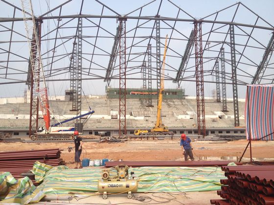 ????4月15日,記者在梧州市體育場的施工現場內看到,體育場的主體建筑已經基本完工,高大的鋼結構折板桁吊裝也已經基本安裝完成。在現場,施工人員正在安裝藍色的玻璃幕墻型門窗以及消防和通風管道。據現場負責人黃華智介紹,目前主要進行室內管道的安裝和裝飾工程,玻璃幕墻型門窗和消防管道的安裝,已經完成了65%,外墻磚面的裝飾工程也已完成75%。施工目前采取交叉作業的形式進行。不同工種的工人隊伍同時在不同地方作業,以確保工程進度有序推進。