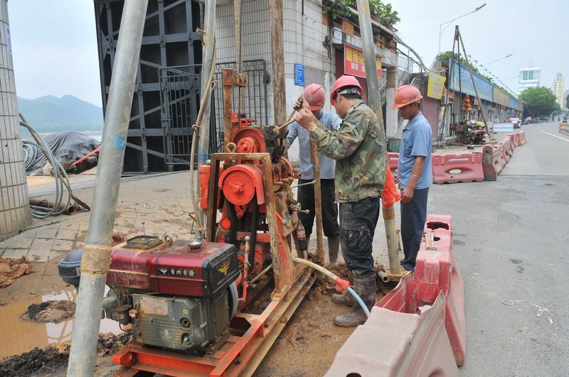 4月16日,在西堤一路,工人正在西堤一路蔬菜碼頭附近堤后道路開鉆水泥孔。