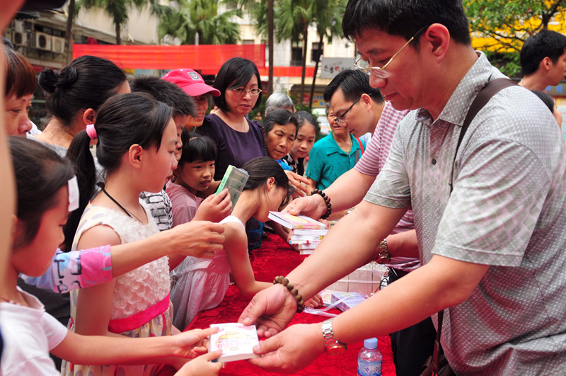 ???? 4月19日,梧州市民在騎樓城中庭廣場喜獲贈書。當日,由梧州市文化新聞出版局主辦、梧州市圖書館和萬秀文化館承辦的“4·23世界讀書日”曁“我們的中國夢”文化進社區(qū)活動在騎樓城中庭廣場舉行。
