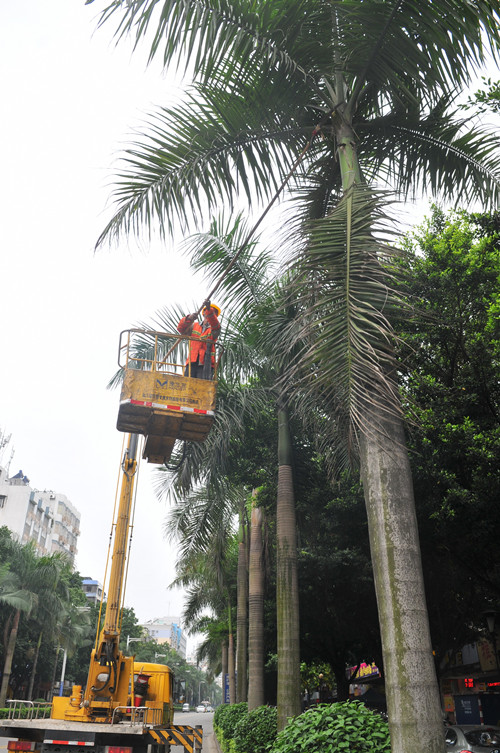 近日,在新興一路,工人正在剪除路邊大樹的枯枝。