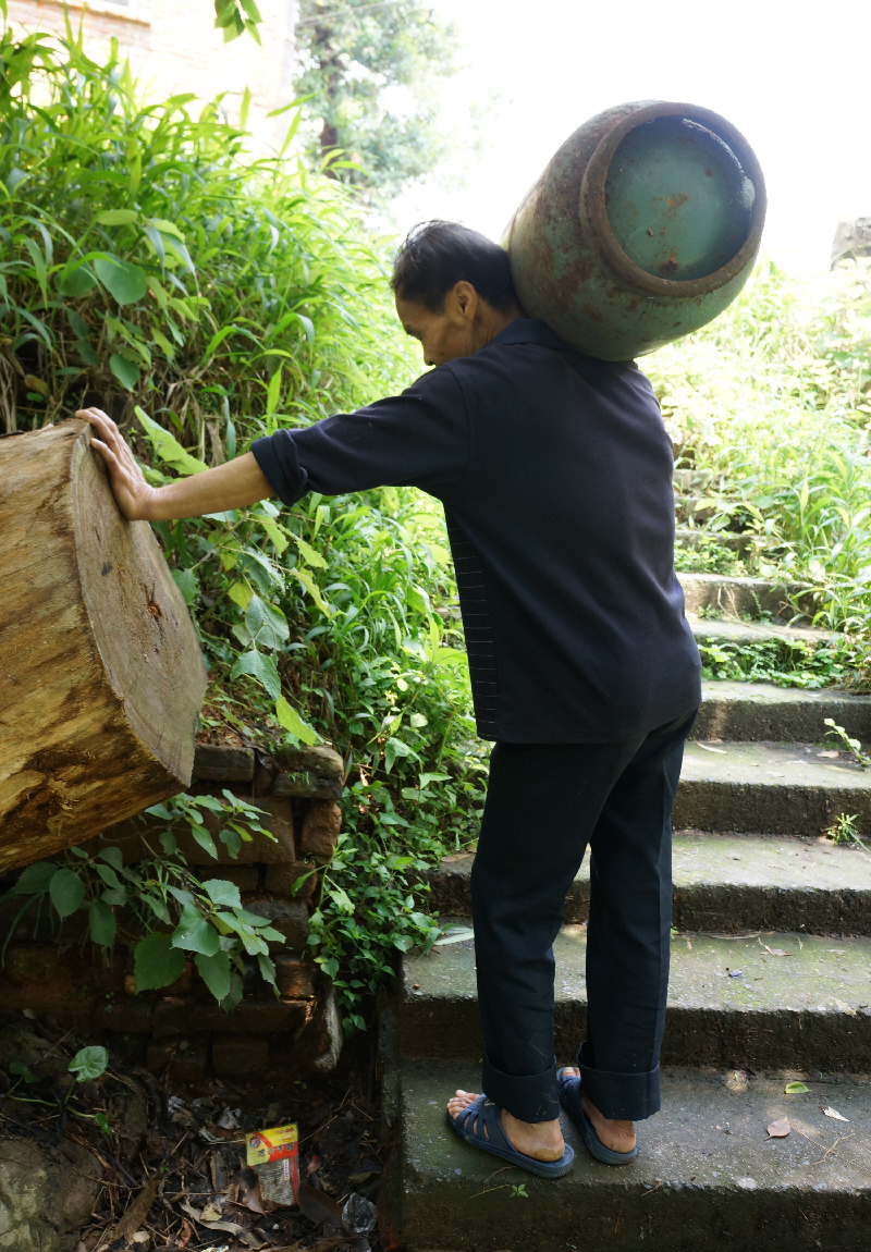 隨著年紀的增長,以往一口氣就可以把燃氣罐背到山頂的袁志榮,如今,中途得??肯聛硇菹⒁幌拢拍芾^續前行。