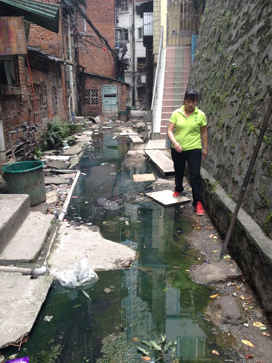 ????“你看,污水都把整個通道給淹沒了!進出只能靠搭蓋在上面的木板了!”住在新興二路95號附近的居民歐先生,帶記者來到位于盛業大廈后的新興二路91號至95號居民樓附近。只見在這幢居民樓后的樓梯出口處,一條長約十余米的通道完全被污水覆蓋。仔細一看,還能隱約看到被臟水浸泡的路面長出了不少的青苔。