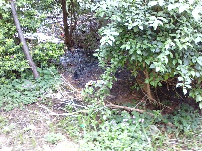 污水已經把花圃的草地淹沒,市工廠二路30號樓一樓的溝渠里積滿了污水,臭氣熏天。 紀榮蘭/攝