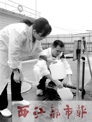 ????兩名水質監測人員立刻拿著容器,分別趕到潯江的原水取水點、水廠內的待濾水取樣點、濾后水取樣點以及出廠水取樣點采集水質樣本。在對水樣進行登記后,廣西城市供水水質監測網梧州監測站開始對樣品進行監測。根據《水質應急處理預案》,水質監控小組的工作人員每30分鐘就要取一次原水、待濾水、濾后水和出廠水,時刻監視著水質的安全。