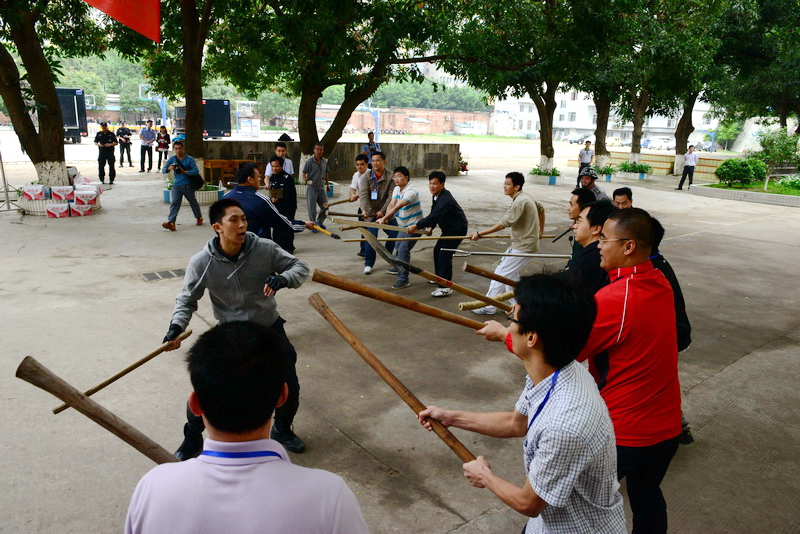 活動模擬校園發(fā)生突發(fā)性暴恐事件,兩名對現(xiàn)實不滿的社會人員手持斧頭、棍棒強行闖入市四中校園,張牙舞爪,企圖在學校制造惡性案件,護校隊十多名人員正在制止“歹徒”。梁觀遠 攝