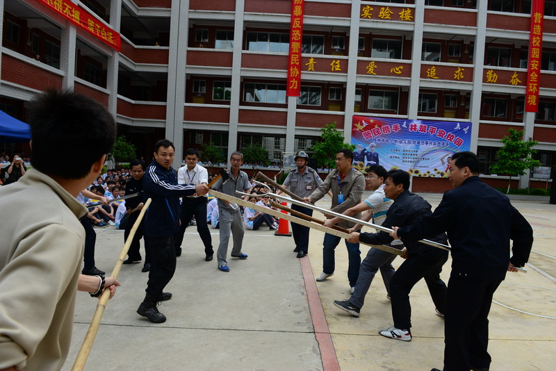 當日,活動模擬校園發(fā)生突發(fā)性暴恐事件。兩名對現(xiàn)實不滿的社會人員手持斧頭、棍棒強行闖入市四中校園,張牙舞爪,企圖在學校制造惡性案件。學校一名保安見狀極力阻止,同時吹響警哨,向操場內(nèi)師生發(fā)出警告。另一名保安則馬上拉響學校報警器(響三聲),向學校領導報告,同時撥打“110”報警,并及時從門衛(wèi)室拿出自衛(wèi)工具加入制止“歹徒”的行列。與此同時,正在操場上體育課的百多名學生在體育老師的引導下緊急有序地向教學樓內(nèi)疏散。