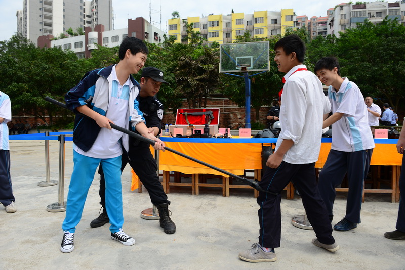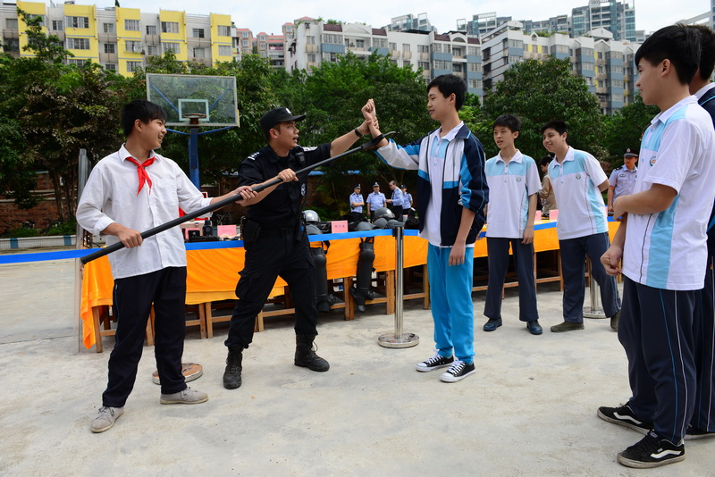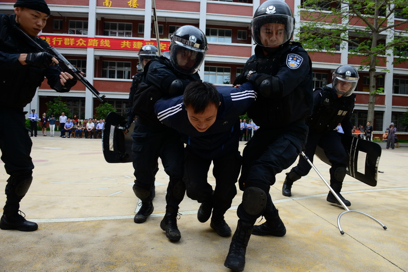 聽到警報后,學校各相關人員立即根據(jù)學校防暴預案,迅速進入各自崗位。十多名護校隊成員手持器械迅速到達事發(fā)現(xiàn)場進行增援,護校隊與“歹徒”雙方對峙博弈,“歹徒”情緒激動,持武器砍打,逐步逼進。雙方到達教學樓內(nèi)的操場時,公安特巡警支隊一輛龍式裝甲車趕到現(xiàn)場,車上下來十多名全副武裝的特警,快速進入角色,他們分成兩組,分別團團圍住兩名“歹徒”,嫻熟地操作鋼叉、盾牌、槍等警用裝備,迅速將“歹徒”叉倒在地上,全程只用了不到一分鐘的時間,便將“歹徒”制服并押走。現(xiàn)場觀看的師生報以熱烈的掌聲。