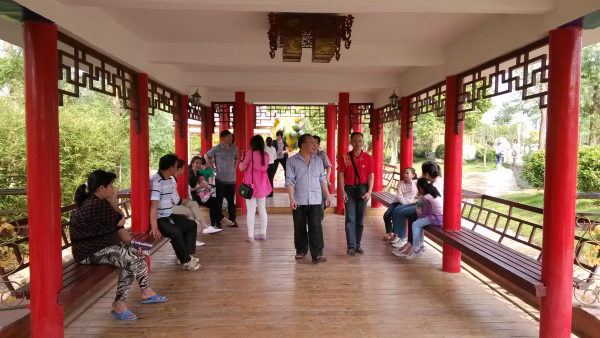 5月2日,在玫瑰湖公園園藝園,游客正在龍舟造型的觀景廊內賞景休憩,在秀美的湖光山色中度過五一假期。 祝琳 攝