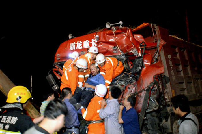 當(dāng)晚22時(shí)許,梧州市119指揮中心接到報(bào)警后,迅速聯(lián)合岑溪市110指揮中心調(diào)集消防、交警、120急救等部門處置。隨后,救援人員到達(dá)現(xiàn)場(chǎng)發(fā)現(xiàn)一輛泥頭車,其車頭與路旁一棵桉樹撞擊后停在路邊,一對(duì)夫妻被困駕駛室內(nèi),男子已接近昏迷,旁邊一輛受撞擊后嚴(yán)重變形的小貨車,其運(yùn)載的三黃雞散落一地,一名中年婦女頭部受傷。