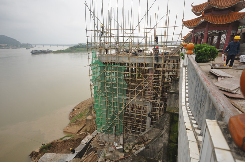 5月7日,施工人員正在對河西防洪堤五四泵站穿堤涵工程加緊施工,目前閘門樓正在進行最后一層的主體施工。