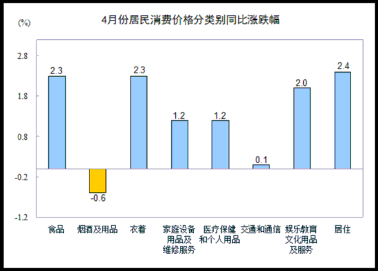 ????4月份,非食品價格環(huán)比上漲0.2%。其中,衣著、娛樂教育文化用品及服務(wù)、家庭設(shè)備用品及維修服務(wù)、居住價格分別上漲0.6%、0.3%、0.1%和0.1%;煙酒及用品、醫(yī)療保健和個人用品、交通和通信價格持平(漲跌幅度為0)。 |