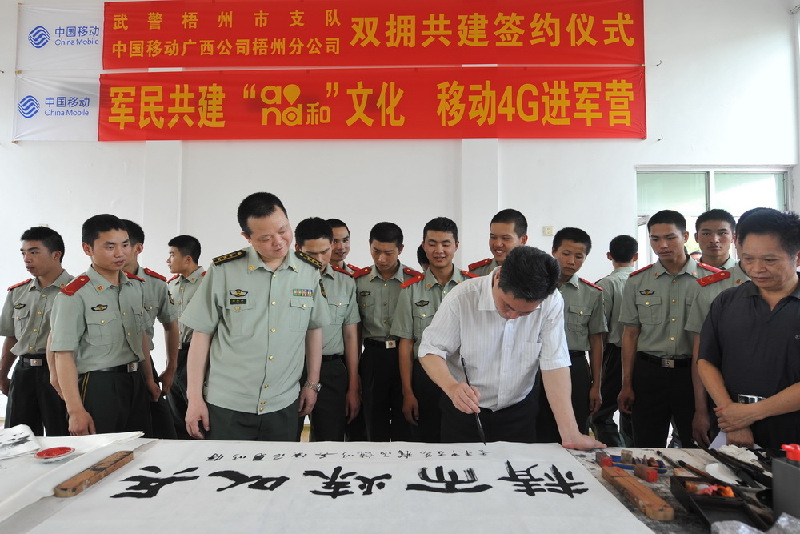為豐富基層官兵的業(yè)余文化生活,培養(yǎng)官兵的藝術(shù)素養(yǎng),中國移動梧州分公司組織書法家到武警梧州市支隊現(xiàn)場獻藝,將先進文化送到廣大官兵身邊,深受官兵的歡迎。孟亞西 李卓凡 攝