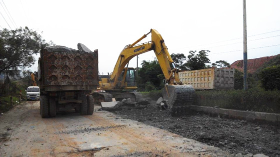5月12日,在南廣鐵路梧州南站附近路段,挖掘機正破拆破損嚴重的路面。 曾燕 攝