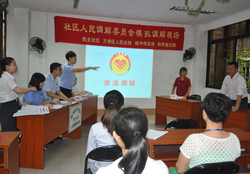 ????據余家敏介紹,民主社區人民調解委員會由萬秀區城中司法所工作人員、和平派出所街警、萬秀區法院法官、社區工作人員及志愿者組成,而日常調解的問題主要集中在下水道或排污渠堵塞、噪音、垃圾、財產繼承、業主與物業矛盾等糾紛,而調解的主要方法為口頭調解和書面調解。