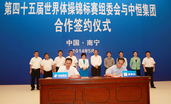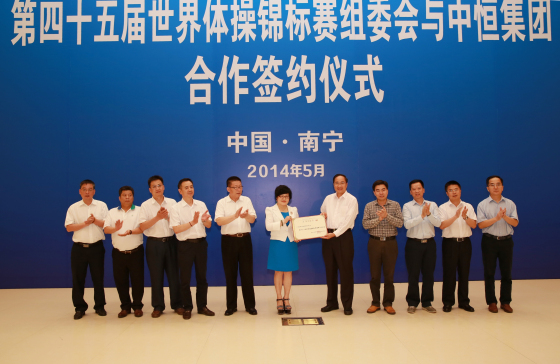 ??? 5月15日,第四十五屆世界體操錦標賽組委會與中恒集團合作簽約儀式在南寧舉行。中恒集團向南寧體操世錦賽提供贊助款物1000萬元人民幣,成為截至15日與組委會合作的最大現金贊助商。
