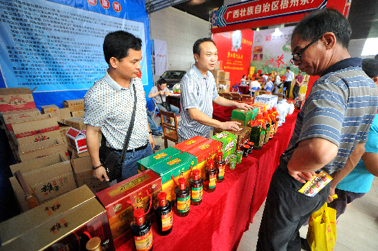 在老字號精品展區,陳列著許多極具梧州特色的產品。如,雙錢牌龜苓膏、龍舟臘腸、新裝嶺南神酒等,均頗受市民青睞。另外,縣市一級的參展企業也帶來許多凸顯其地方特色的產品。其中,蒙山金宇特色農業發展有限公司帶來了綠色放養的黑土豬肉;蒙山縣鴻惠食品廠帶著香脆可口的“阿養木瓜”亮相;藤縣象棋祖創土特產購銷部則迎合時下健康飲食潮流,展示了紅菇、散裝野生茶油禮盒。