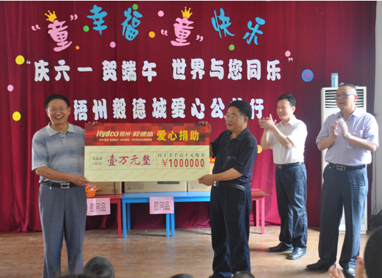 ??? 為了讓梧州市社會福利院里的老人和小孩在端午、六一這兩個節日里感受到節日的溫暖,5月29日,以梧州毅德商貿物流城開發有限公司副總經理彭永紅為代表的慰問隊伍,帶上電視機、吊扇等慰問物品及節日慰問金,來到梧州市社會福利院,為福利院里的老人和小孩送上節日的最美好祝福。梧州市民政局副局長王勇,梧州市社會福利院院長蔡文等領導出席了此次活動。