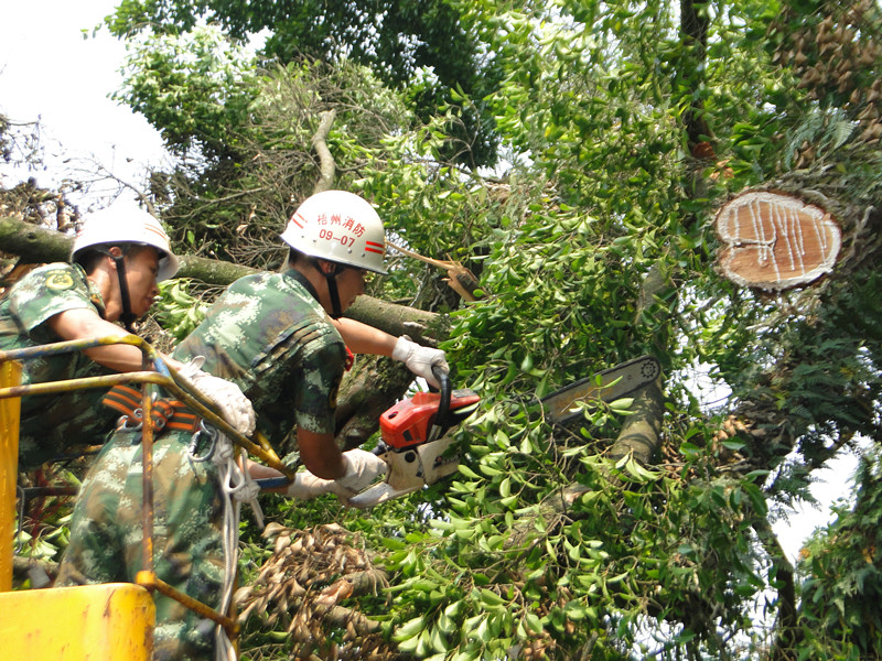 蒙山消防大隊官兵正在鋸斷古榕的樹枝。