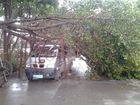 ??? 6月24日18時,連續幾天的暴雨,致使岑溪市區沿江路一株大榕樹的樹椏突然斷裂倒下,倒伏下來的大椏枝葉占據了一半路面,并將停放在路邊的一輛小型貨車壓在下面,幸而沒有人員傷亡。