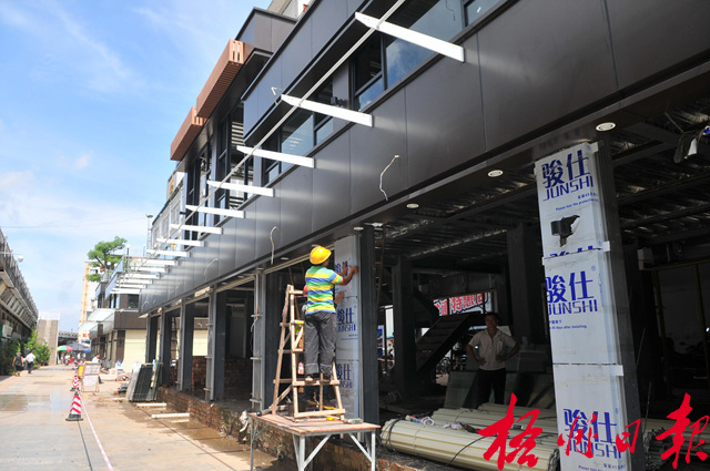 ????7月15日,在鴛江麗港,工人正為商業特色街改造工程的新店鋪裝修。