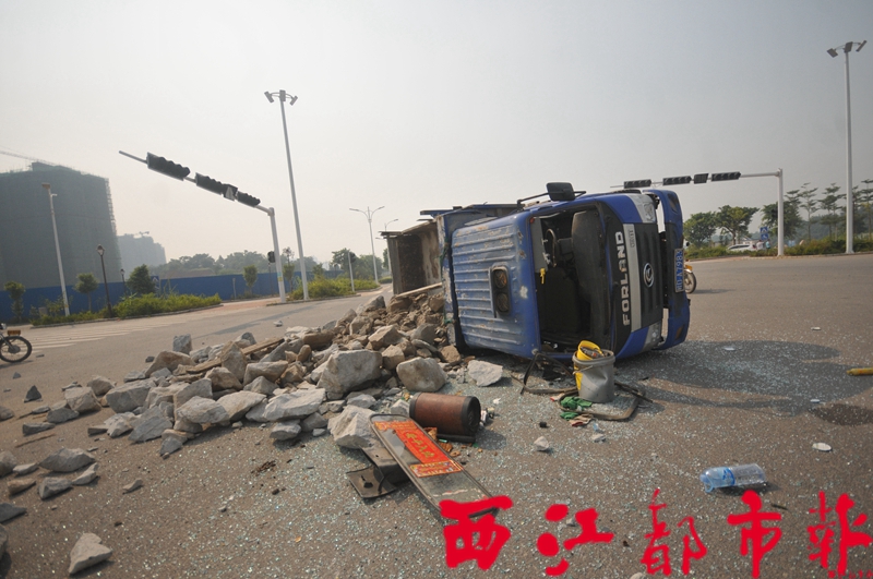 事故致使運輸貨車側翻并嚴重受損,車上的石頭散落一地。