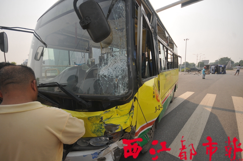 ??? 西江都市報訊 (記者 蒙紹松)7月23日上午9時許,一輛運載石頭的運輸車,與一輛31路公交車,在梧州火車站前不遠的十字路口發生碰撞,造成交通事故。事故致使公交車車頭有明顯傷痕、貨車整個車體側翻。