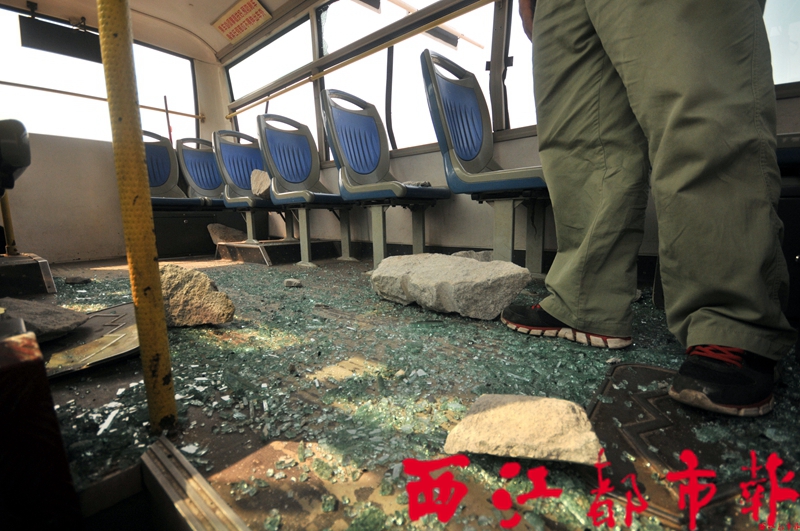 公交車內散落一地的碎玻璃,幾塊石頭撞碎車窗玻璃后滾進車廂。
