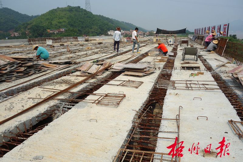 ??? 7月24日,在粵桂合作特別試驗區起步區的大園橋,施工人員在橋面焊接T梁間的鋼筋。