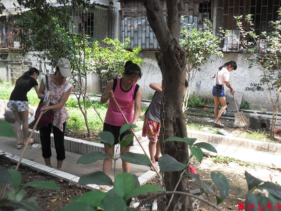 記者紀(jì)榮蘭(左二)和學(xué)生志愿者們一起清掃京梧社區(qū)里的衛(wèi)生死角。 本報(bào)記者 紀(jì)榮蘭/文 通訊員 李巧瓊/攝