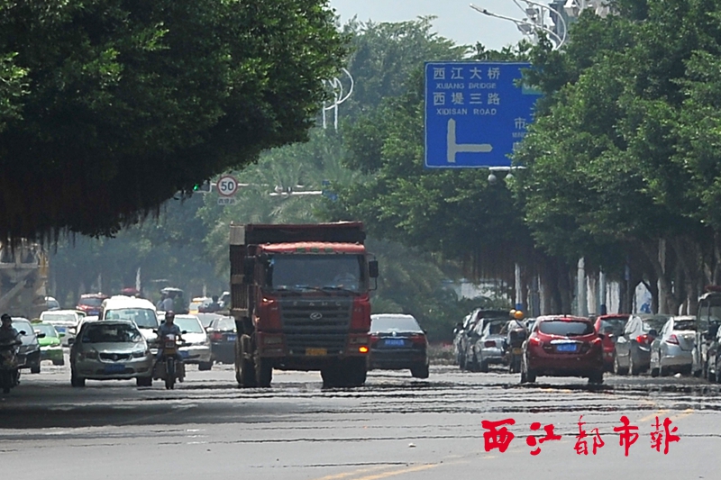??? 8月3日下午3時許,猛烈的陽光照射在梧州市西堤路上,遠遠望去,車輛仿佛在濕漉漉的路面上行駛。